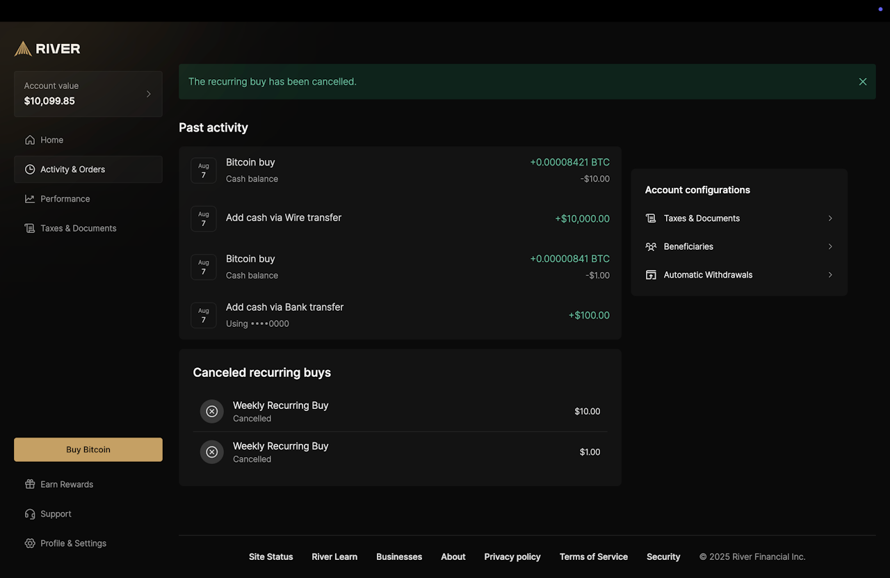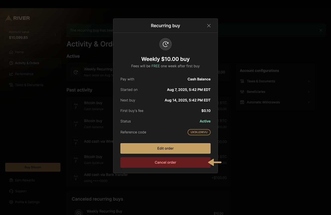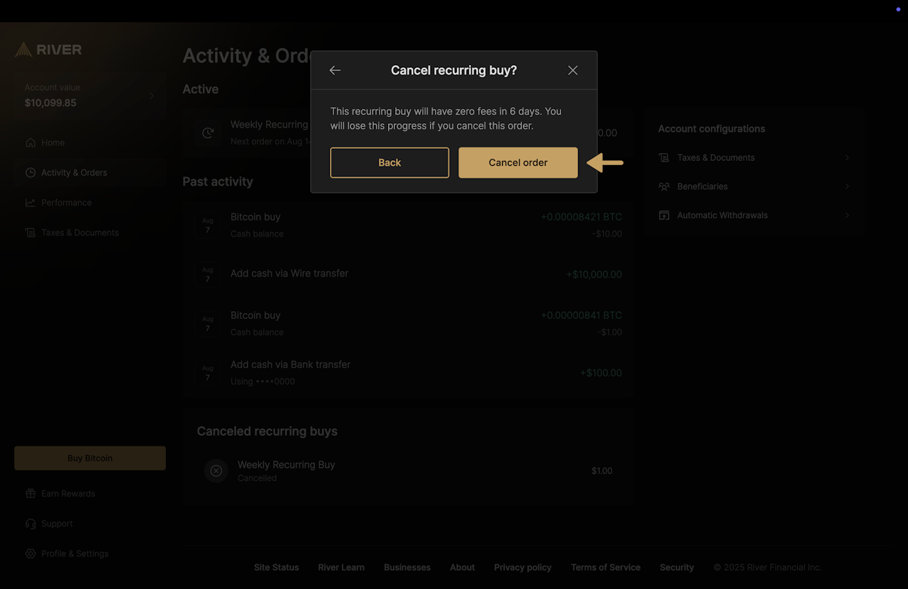 After logging into river.com, select “Activity & Orders” on the left side of the screen. If you are using the River app, you will need to select “Account” at the bottom of the screen to see active recurring orders.