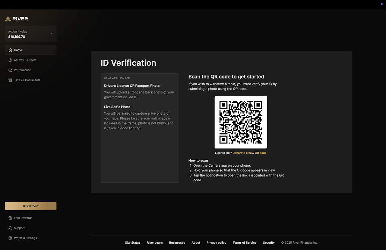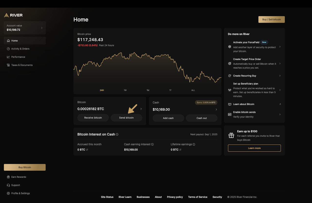 To upload your documentation, click on the “Send bitcoin” button on your River homepage.