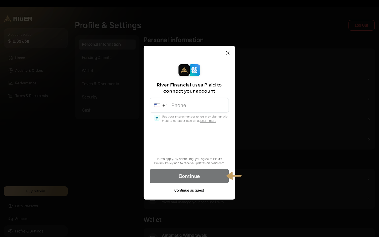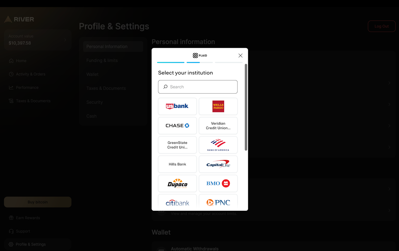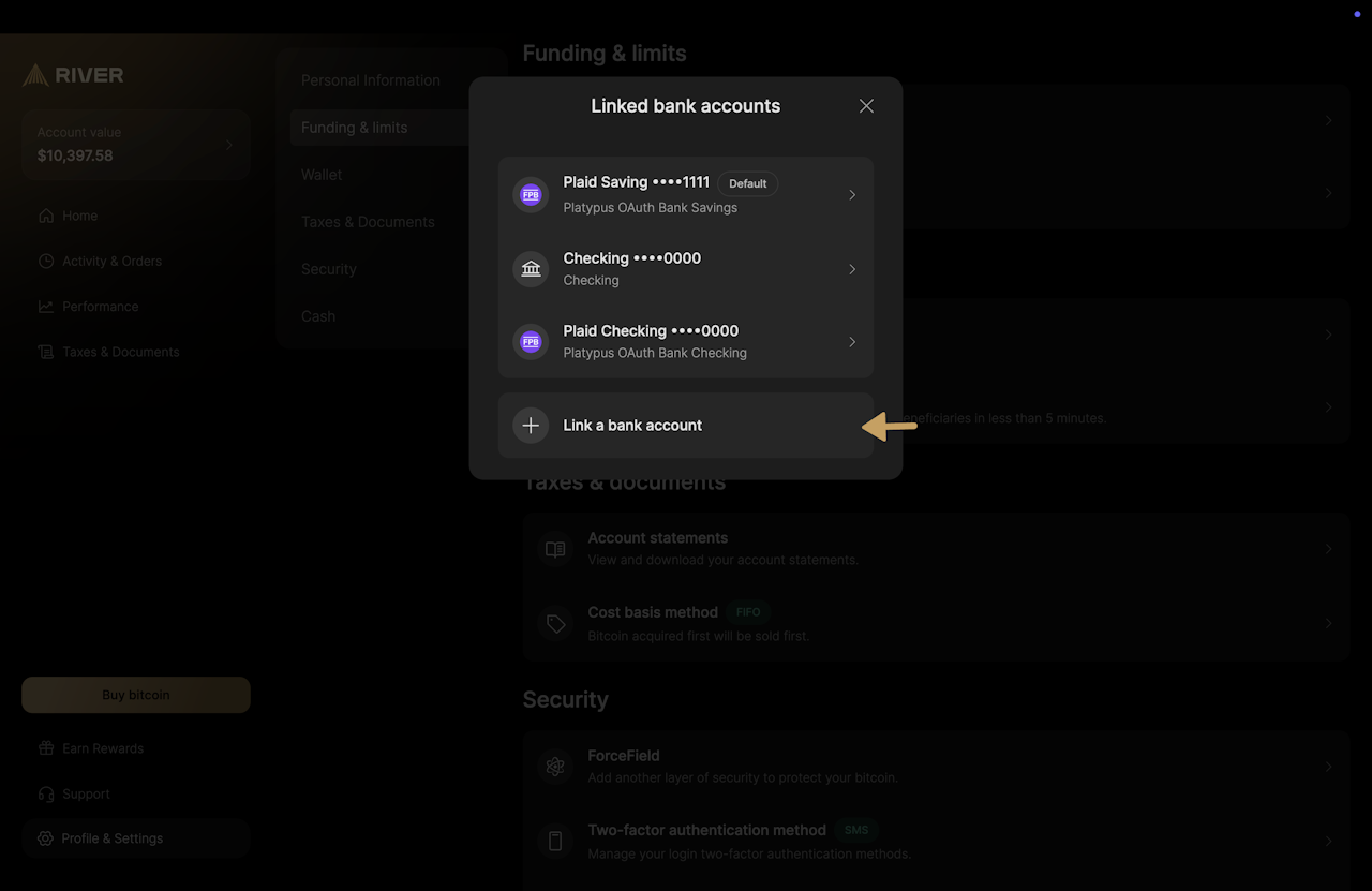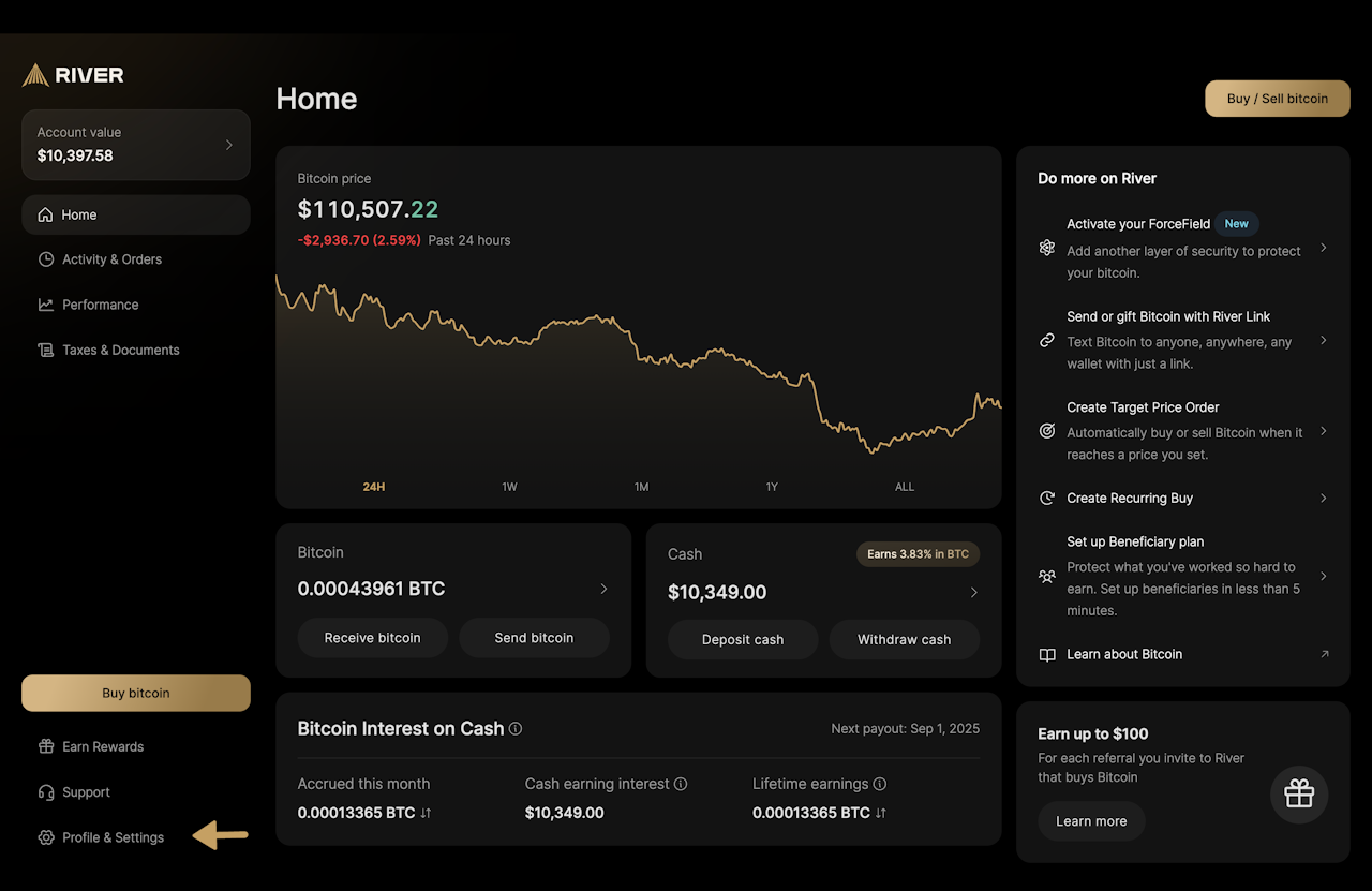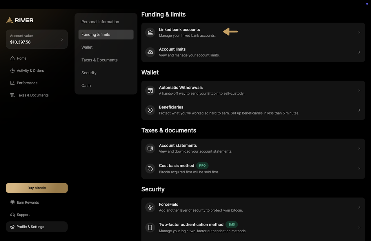 To link a bank account, go to “Profile & Settings,” found in the bottom-left corner of your River homepage.