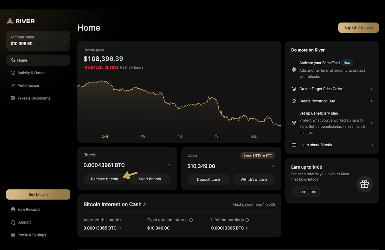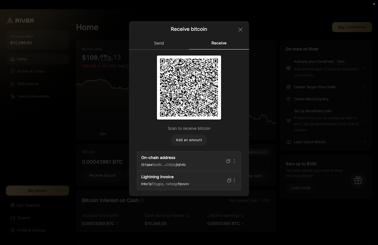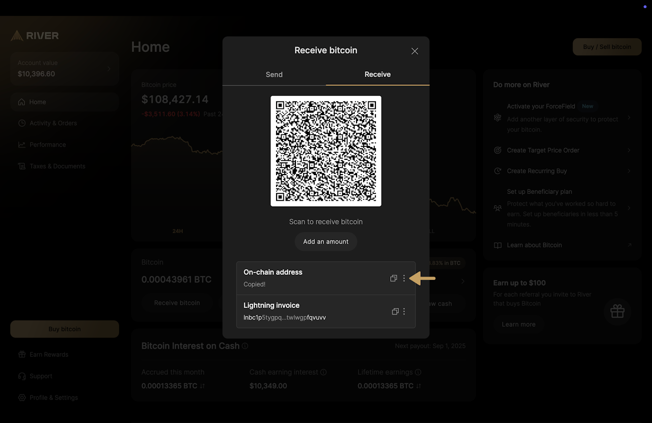 There are two methods to receive bitcoin into your River account, on-chain and the Lightning Network. This guide will explain both methods of receiving bitcoin.