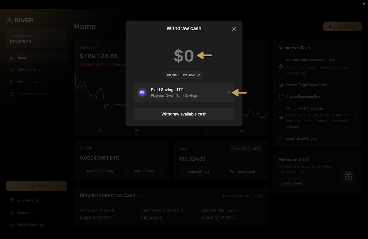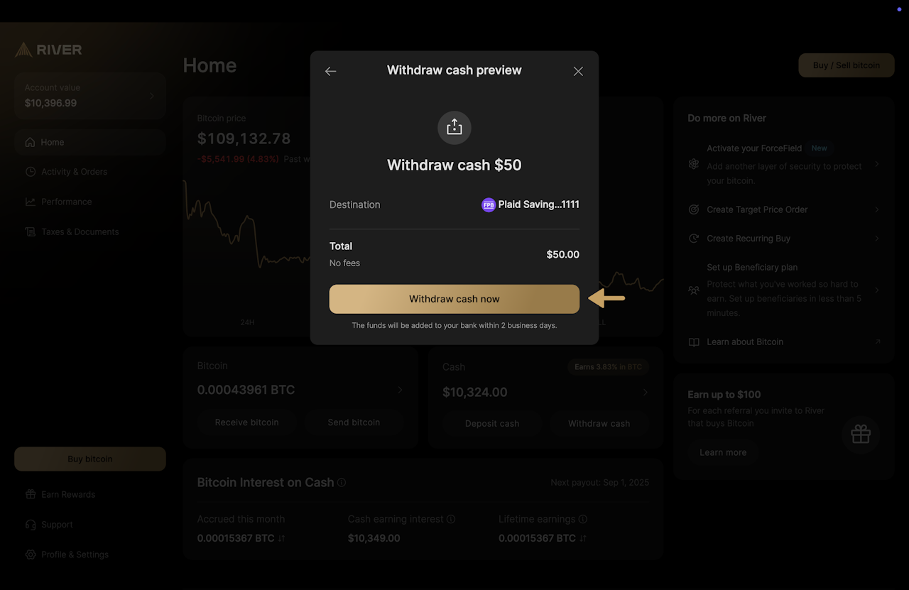 This guide explains how to withdraw cash from your River cash balance to your linked bank account.