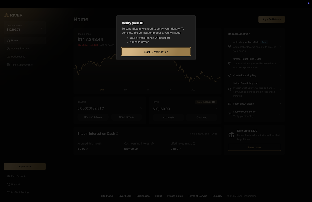 To upload your documentation, click on the “Send bitcoin” button on your River homepage.